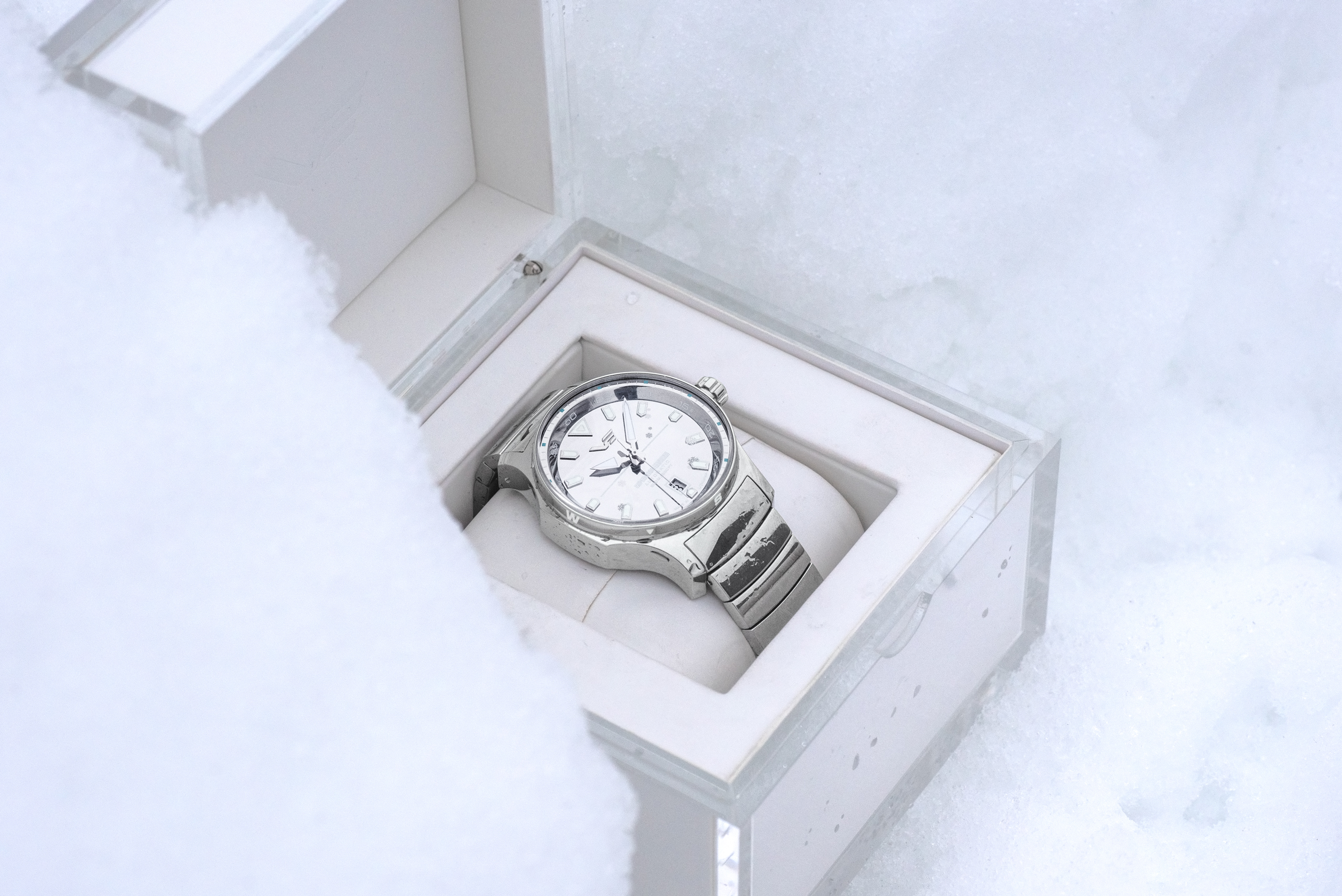 Zrcadlově leštěný povrch pouzdra, ciferníku i náramku odráží světlo jako led při východu slunce.