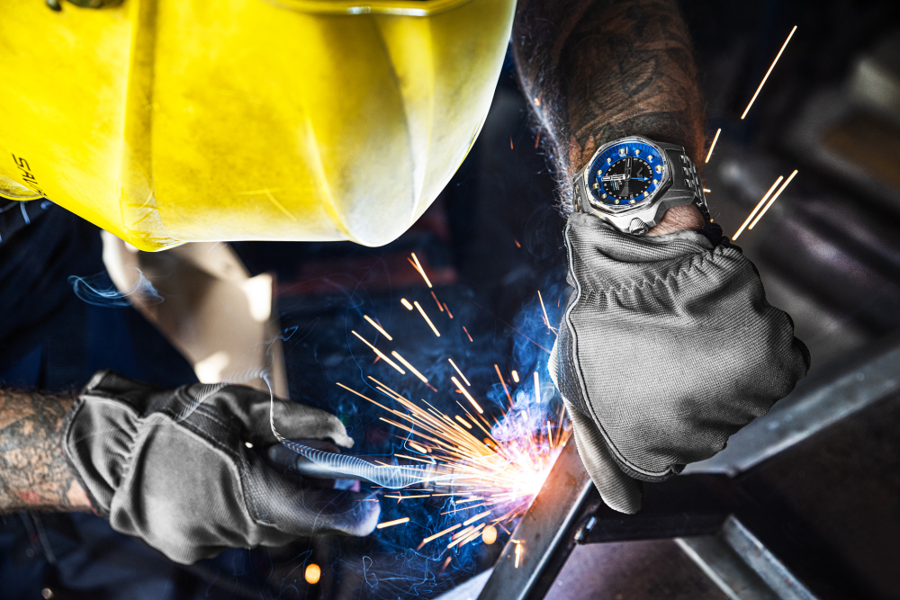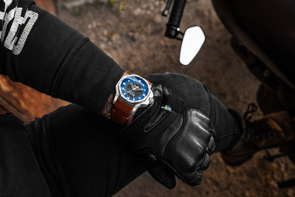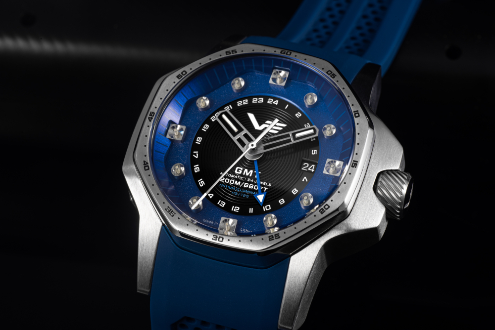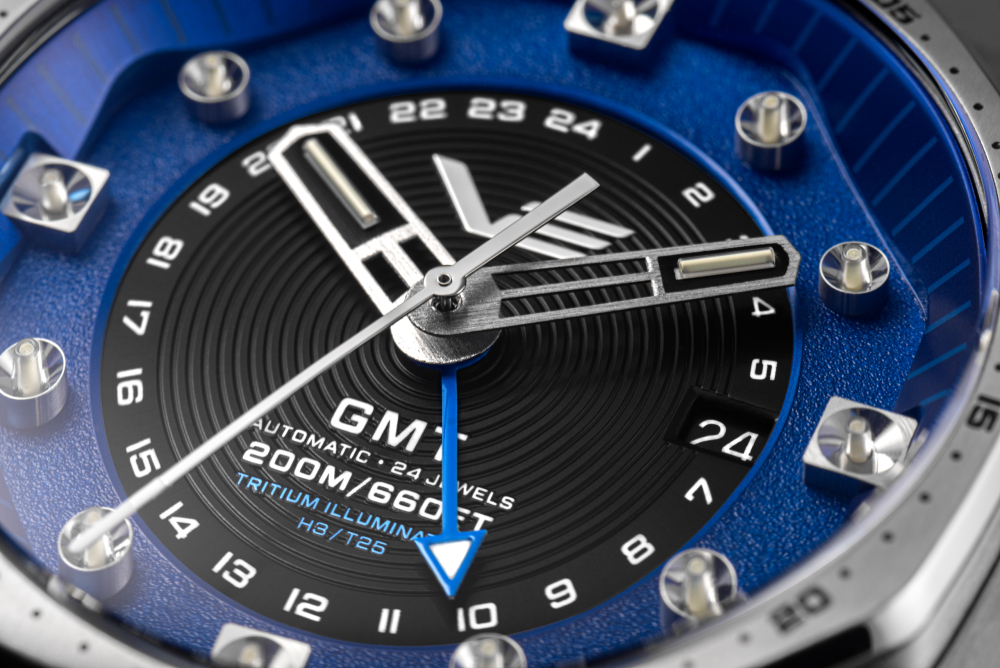 - ciferník: dvojvrstvý, střed černý a modrá vnitřní luneta se zrnitou texturou