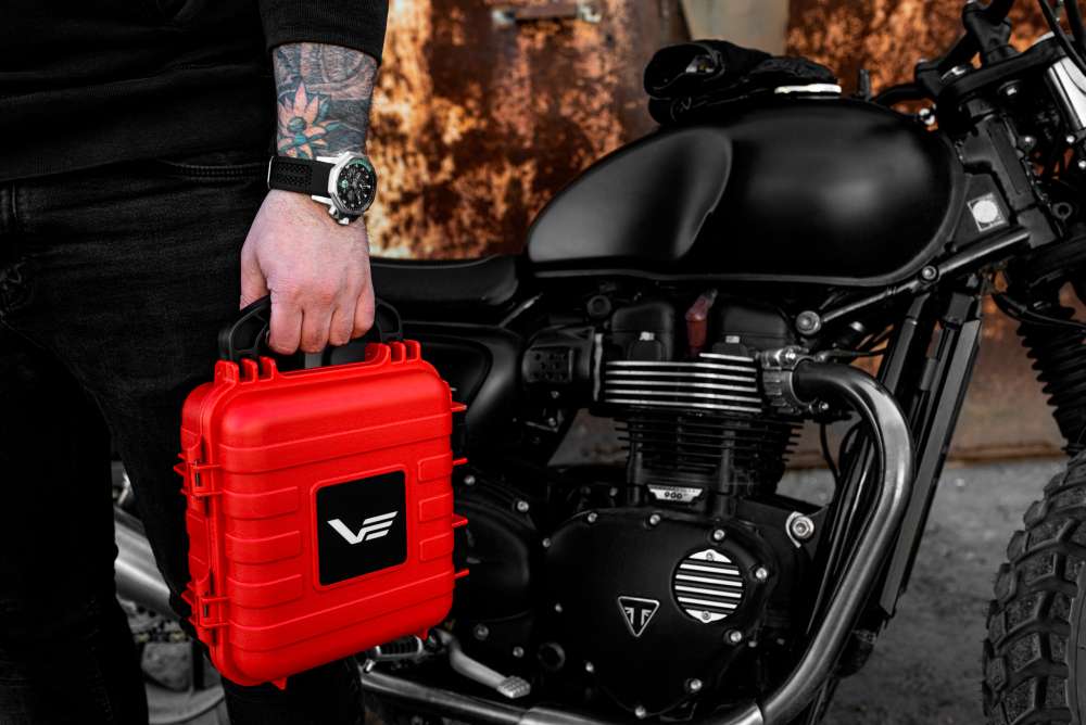 - balení: červená vodotěsná krabice XL 10 ATM s náhradním silikonovým remínkem, šroubovákem, záruční knížkou s pečátkou oficiálního dovozce pro Slovensko a dokladem o zkoušce vodotěsnosti od výrobce. Krabice může sloužit jako úložný prostor pro 4 ks hodinek a náhradní remínky.