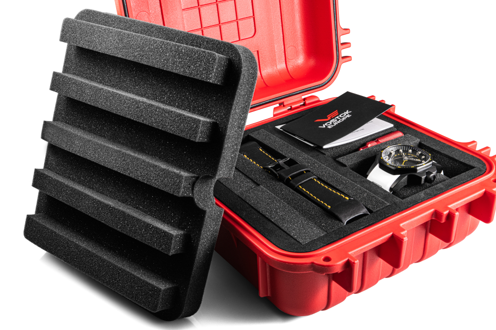 - balení: červený vodotěsný box XL 10 ATM s náhradním silikonovým řemínkem, šroubovákem, záruční knížkou s pečetí oficiálního dovozce pro Slovensko a dokladem o zkoušce vodotěsnosti od výrobce. Box může sloužit jako úložný prostor pro 4 ks hodinek a náhradní řemínky.