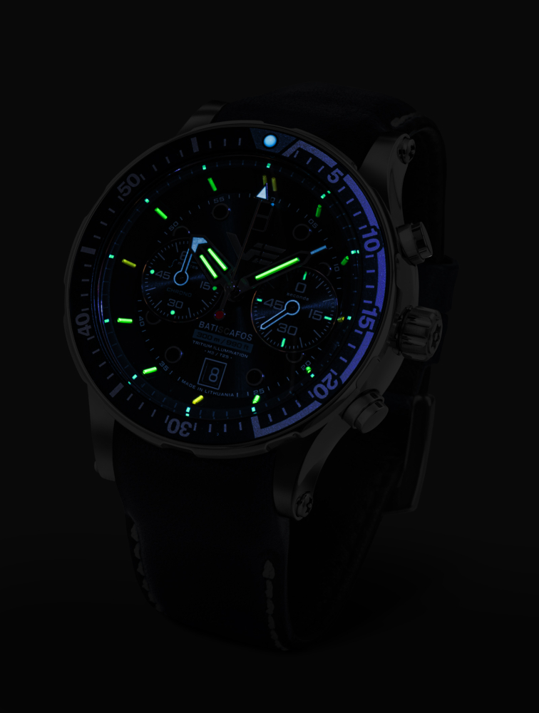 - osvětlení ciferníku: tritium (16 tritiových kapslí švýcarské výroby: 13 ks na indexech, 2 ks na hodinové a 1 ks na minutové ručičce) a Super Luminova
