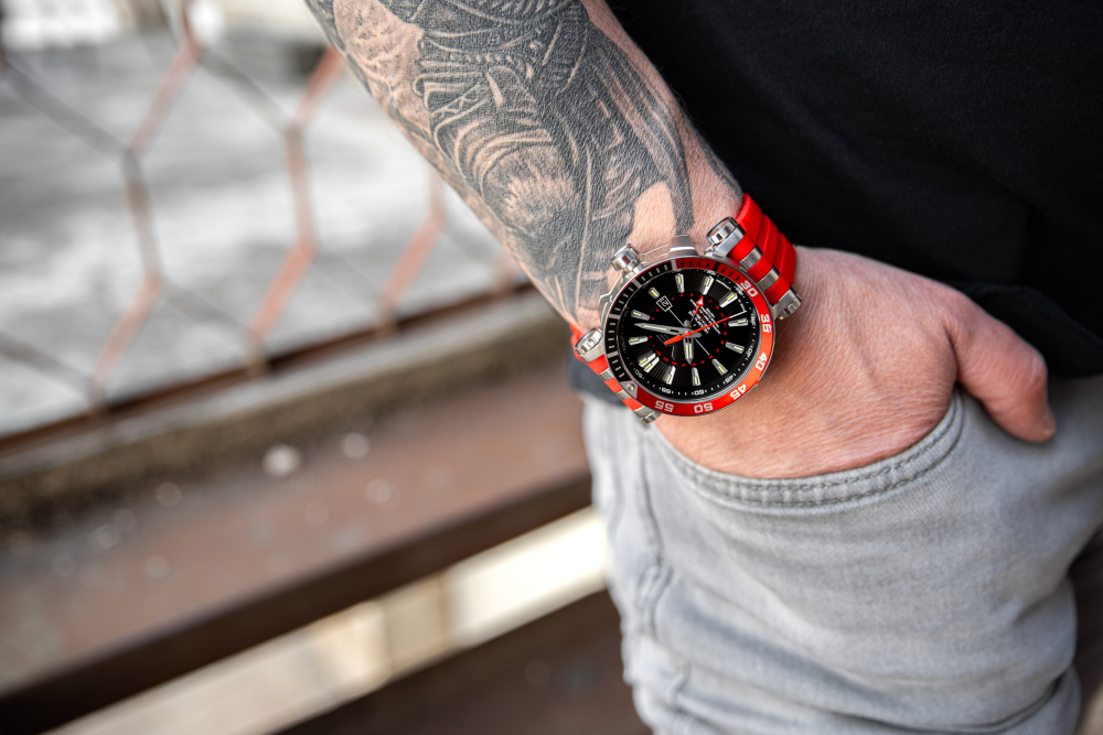 - řemínek: silikonový černý a kožený černý štěpovaný černou a červeně