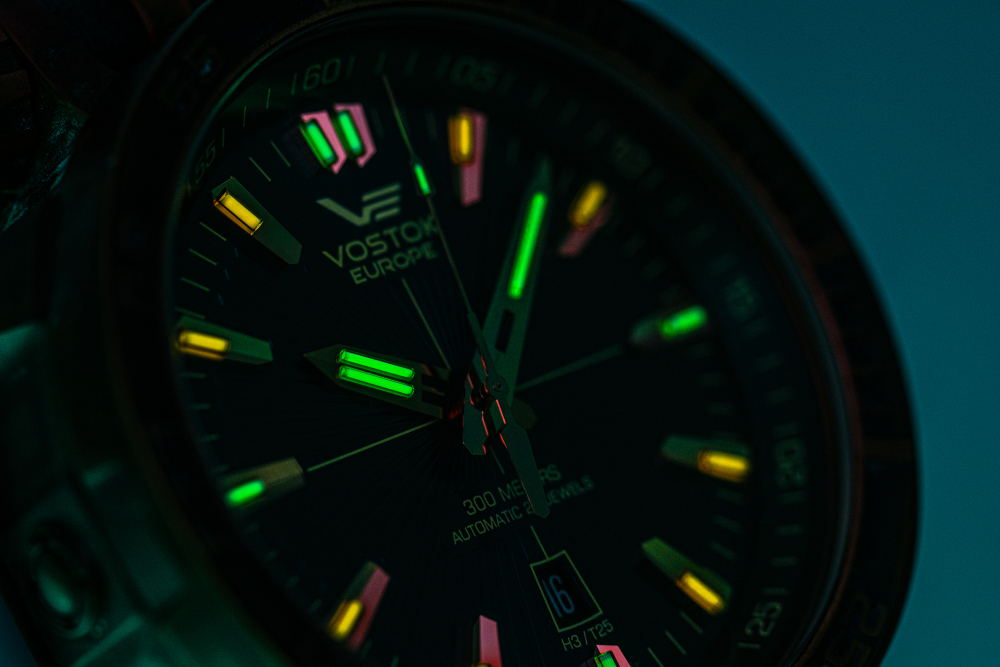 - Osvětlení ciferníku: tritium (18 tritiových kapslí: 13 ks na indexech, 2 ks na hodinové, 1 ks na minutové, 1 ks na otočné lunetě)