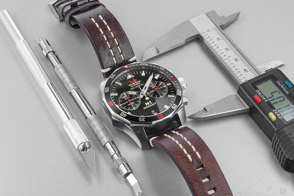 pánské hodinky Vostok-Europe s quartzovým strojkem s funkcí chronografu, na hnedom silikonovém řemínku