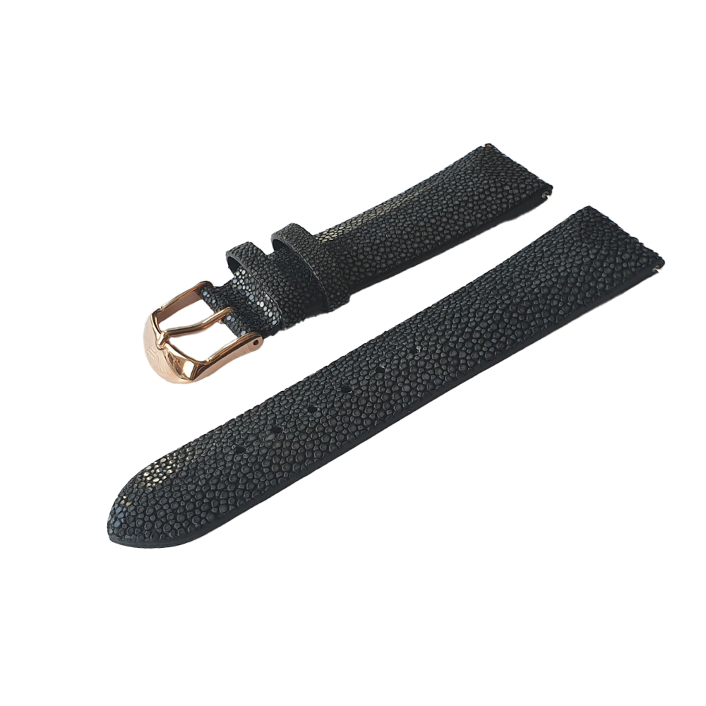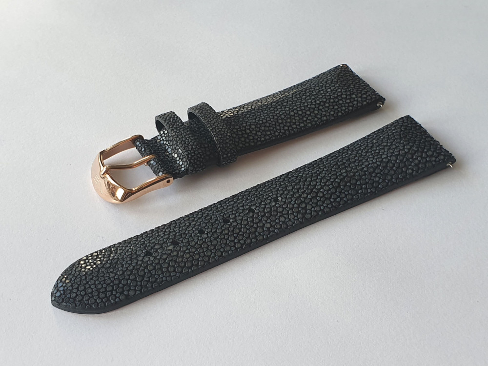 - materiál: pravá kůže z rejnoka. Kůže rejnoka je pokryta malými výstupky, které se obrušují a vzniká tak zajímavý třpytivý efekt. Díky tomu získávají vaše hodinky výjimečný vzhled a hodí se na všechny společenské akce, protože třpytivý řemínek krásně vynikne na vaší ruce a upoutá pozornost okolí.