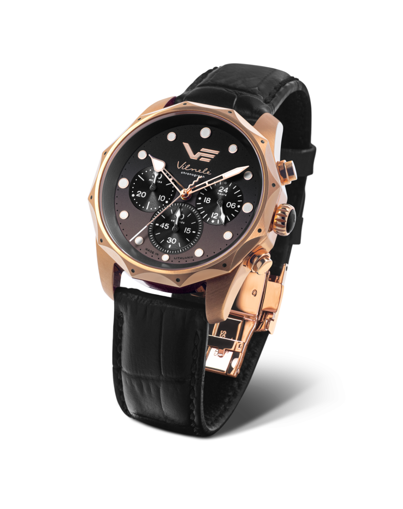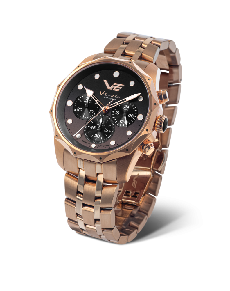 Tyto dámské chronografy, inspirované řekou Vilnele, kombinují přirozenou eleganci s moderní všestranností. Pouzdro z chirurgické oceli má vlnitou lunetu, která imituje vlnivý pohyb vody a výborně se hodí buď k integrovanému kovovému náramku, nebo kůže či silikonový řemínek. Hodinky jsou poháněny přesným quartzovým strojkem s funkcí chronografu a mají třpytivý ciferník, který mění tón jako světlo na hladině tekoucí vody. Díky safírovému sklíčku a vodotěsnosti 100 metrů jsou hodinky dokonale vhodné pro každodenní život a outdoorové aktivity.