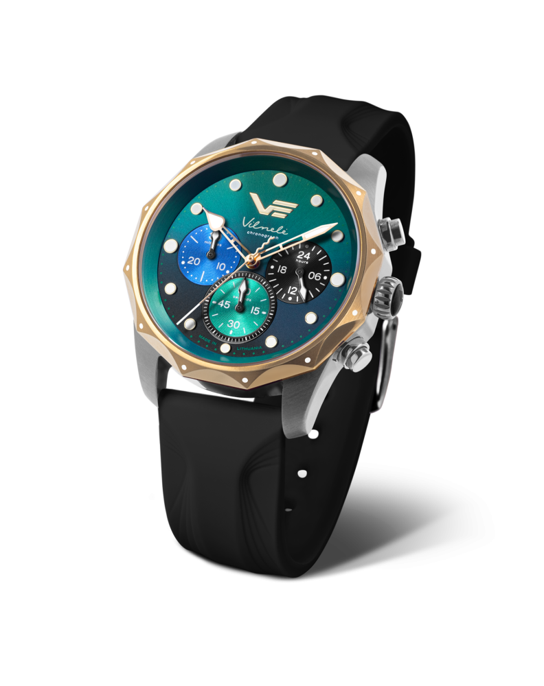 Tyto dámské chronografy, inspirované řekou Vilnele, kombinují přirozenou eleganci s moderní všestranností. Pouzdro z chirurgické oceli má vlnitou lunetu, která imituje vlnivý pohyb vody a výborně se hodí buď k integrovanému kovovému náramku, nebo kůže či silikonový řemínek. Hodinky jsou poháněny přesným quartzovým strojkem s funkcí chronografu a mají třpytivý ciferník, který mění tón jako světlo na hladině tekoucí vody. Díky safírovému sklíčku a vodotěsnosti 100 metrů jsou hodinky dokonale vhodné pro každodenní život a outdoorové aktivity.