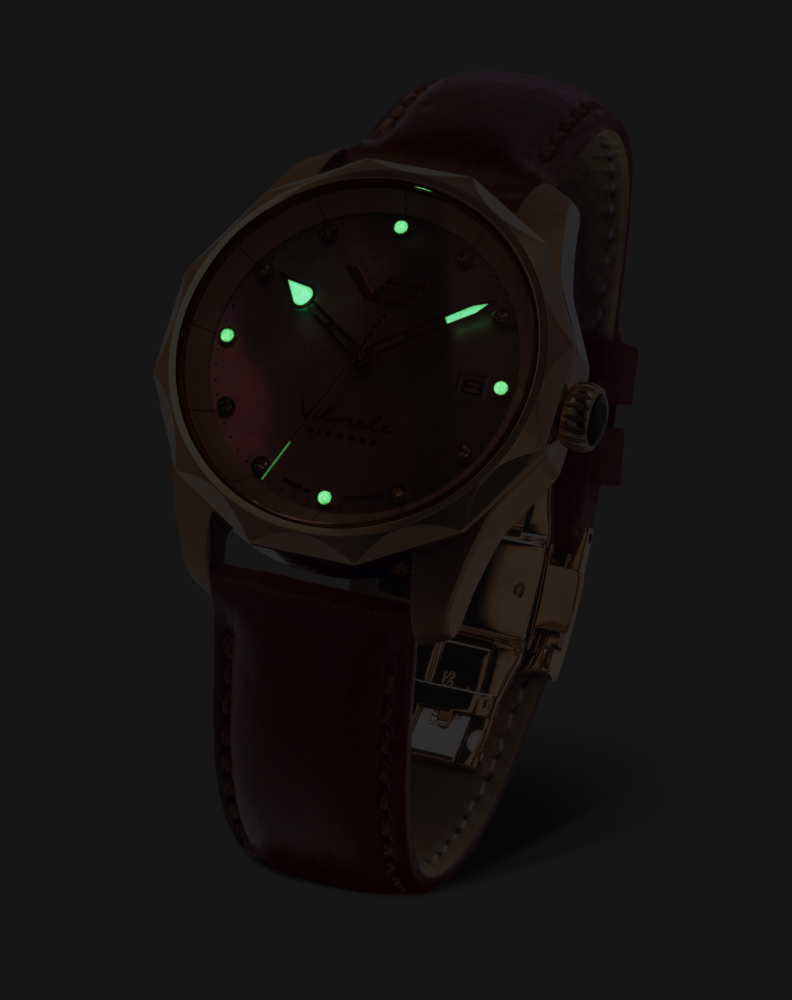 Tento model je poháněn solárním strojkem SEIKO EPSON a vyznačuje se poloprůhledným perleťovým číselníkem, který je ozdoben 8 pravými diamanty – jemným nádechem luxusu. Solární strojek se nabíjí přirozeným i umělým světlem, čímž se eliminuje potřeba pravidelné výměny baterie a je tak zajištěn dlouhotrvající výkon s minimální údržbou.