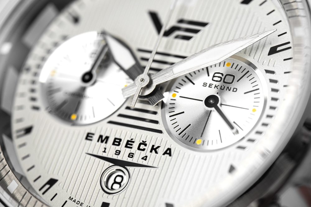 60minutový chronograf: (centrální vteřinová ručička chronografu a boční minutová ručička chronografu na pozici 9. hodiny)