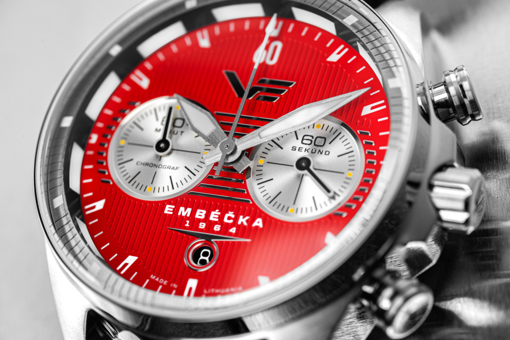 60minutový chronograf: (centrální vteřinová ručička chronografu a boční minutová ručička chronografu na pozici 9. hodiny)