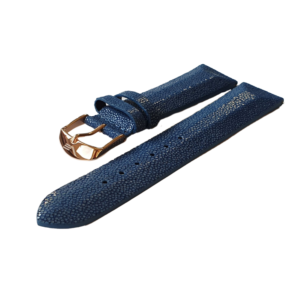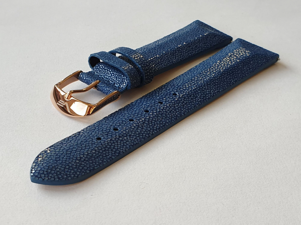 - materiál: pravá kůže z rejnoka. Kůže rejnoka je pokrytá malými výstupky, které se obrušují a vzniká tak zajímavý třpytivý efekt. Díky tomu získávají vaše hodinky výjimečný vzhled a hodí se na všechny společenské akce, protože třpytivý řemínek krásně vynikne na vaší ruce a upoutá pozornost okolí.