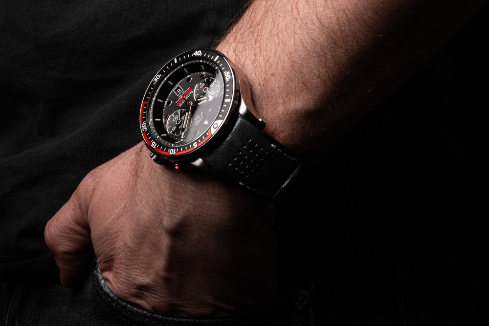 - 60minutový chronograf (centrální sekundová ručička chronografu a boční minutová ručička chronografu v poloze 9 hod.)