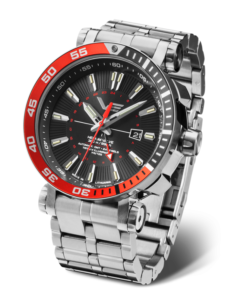 - funkce: hodiny, minuty, vteřiny, indikace 24-hodinového času a GMT, tichý timer, šroubovací korunka, & nbsp;heliový ventil