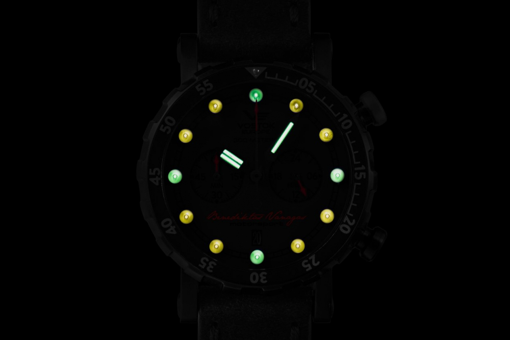 - podsvícení ciferníku: trícium (15 tríciových kapslí: 12 ks na indexech, 2 ks na hodinové, 1 ks na minutové ručičce)