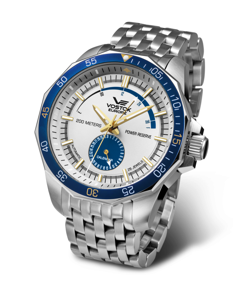 Mechanický strojek s automatickým nátahem a možností ručního nátahu, s centrálním ukazatelem rezervy chodu a ukazatelem data.