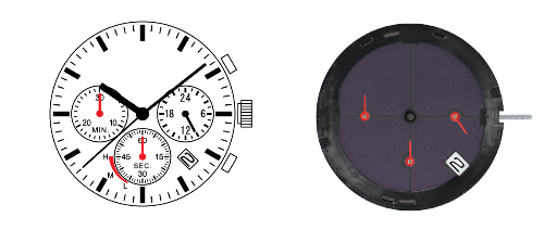 30 minutový chronograf: sekundová ručička chronografu v poloze 6 hod., minutová ručička chronografu v poloze 9 hod.