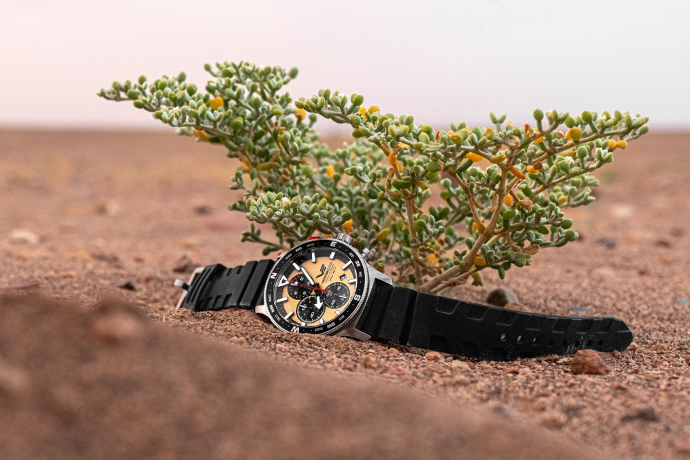 Farebná paleta ciferníka odráža samotnú Saharu: teplé piesočné odtiene púštnej krajiny kontrastujú s hlbokými čiernymi akcentmi, ktoré vzdávajú hold tradičnému oblečeniu Tuaregov. Pieskovaná a brúsená povrchová úprava puzdra pripomína povrchy tvarované vetrom a pieskom. Róbustná konštrukcia puzdra zaisťuje odolnosť voči prachu a vode s vodotesnosťou 20 ATM, čím chráni hodinky pred púštnymi búrkami, teplom a extrémnymi podmienkami.