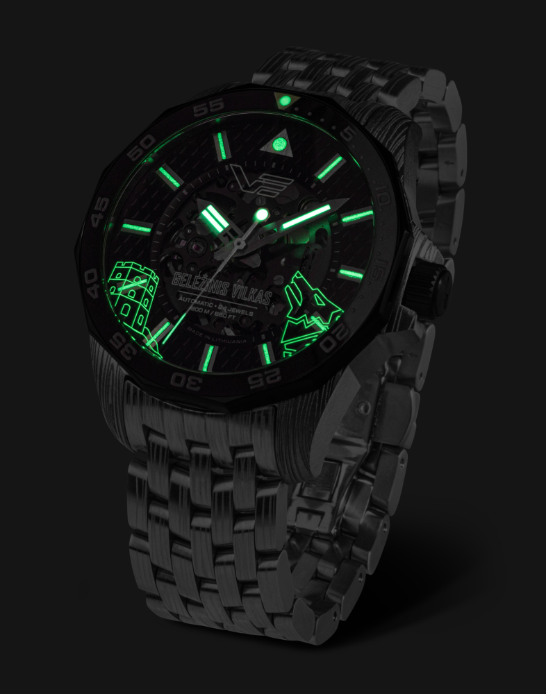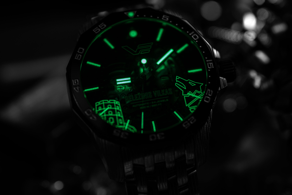 Limitovaná edícia Geležinis Vilkas je vyrobená v počte 701 kusov.. Sú to sofistikované hodinky, ktoré stelesňujú surovú eleganciu a modernú precíznosť.Dizajn hodiniek bol vyrobený v súlade s legendou o založení mesta Vilnius s obrazom železného vlka s kovovým brnením a mechanickým srdcom vo vnútri.