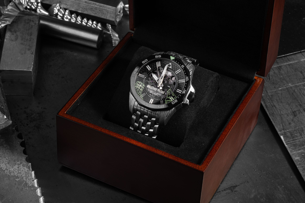 - ciferník: černý skeletizovaný ciferník s 3D vzorem a kovovými indexy